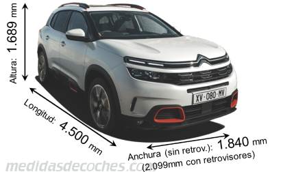 Espacio interior de 5 plazas.Con mayor espacio en la segunda fila de asientos y un generoso maletero, el Citroën C5 Aircross 2025 es un SUV confortable con su amortiguación hidráulica progresiva. El Citroen C5 Aircross tiene una longitud de 4652 mm, altura de 1660 mm y anchura de 1902 mm sin los espejos retrovisores exteriores. El modelo eléctrico recibe el nombre de ë-C5 Aircross y tiene una capacidad del maletero de 565 litros. Por su tamaño, características y altura libre al suelo de 20 cm, clasificamos el Citroen C5 Aircross en la categoría de SUV medianos. Este nuevo modelo destaca por ser 152 mm más largo respecto a las medidas del Citroen C5 Aircross 2022.