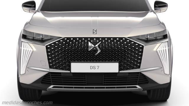 Espacio interior de 5 plazas.Combinando técnica, elegancia y savoir-faire francés, el DS7 2023 renueva el frontal con una nueva generación de firmas luminosas. El DS DS7 tiene una longitud de 4595 mm, altura de 1631 mm, anchura de 1895 mm sin espejos retrovisores exteriores y una medida de 2098 milímetros con los retrovisores abiertos. El modelo híbrido enchufable recibe el nombre de DS7 E-Tense. Por su tamaño, características y altura libre al suelo de 19 cm, clasificamos el DS DS7 en la categoría de SUV medianos. Este modelo del año 2023 es 22 mm más largo, tiene la misma anchura y tiene la misma altura respecto a las medidas del DS DS7 Crossback 2018.