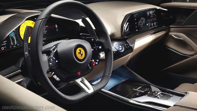 Espacio interior de 4 plazas.Con prestaciones, placer de conducir y confort en perfecta armonía, el nuevo Ferrari Purosangue 2023 es el primer coche en la historia de la marca del Cavallino Rampante con cuatro puertas y cuatro plazas. El Ferrari Purosangue tiene una longitud de 4973 mm, altura de 1589 mm y anchura de 2028 mm sin los espejos retrovisores exteriores.