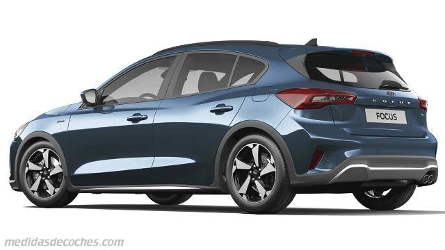 Espacio interior de 5 plazas.El Ford Focus Active 2022 cuenta con 30 milímetros de mayor altura libre al suelo y revestimientos protectores del paso de rueda y bajos. El Ford Focus Active tiene una longitud de 4397 mm, altura de 1502 mm, anchura de 1844 mm sin espejos retrovisores exteriores y una medida de 1979 milímetros con los retrovisores abiertos. Por su tamaño, características y altura libre al suelo de 16 cm, clasificamos el Ford Focus Active en la categoría de SUV compactos. Este modelo del año 2022 tiene el mismo tamaño respecto a las medidas del Ford Focus Active 2019.