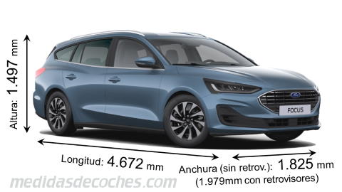 Espacio interior de 5 plazas.29 centímetros más largo que el compacto, el Ford Focus Sportbreak 2022 tiene un espacioso interior y un maletero de mayor capacidad. El Ford Focus Sportbreak tiene una longitud de 4672 mm, altura de 1497 mm, anchura de 1825 mm sin espejos retrovisores exteriores y una medida de 1979 milímetros con los retrovisores abiertos. Por su versatilidad y mayor espacio trasero, clasificamos el Ford Focus Sportbreak en la categoría de coches familiares. Este modelo del año 2022 tiene la misma longitud, tiene la misma anchura y 16 mm más alto respecto a las medidas del Ford Focus Sportbreak 2018.