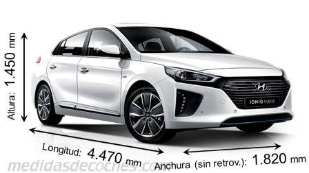 Espacio interior de 5 plazas.Con tres opciones diferentes de tecnología: híbrida, híbrida enchufable o completamente eléctrico, el Hyundai IONIQ 2020 tiene un diseño de líneas límpias y aerodinámicas. El Hyundai IONIQ tiene una longitud de 4470 mm, altura de 1450 mm y anchura de 1820 mm sin los espejos retrovisores exteriores. El modelo híbrido enchufable recibe el nombre de IONIQ Híbrido-enchufable y tiene una capacidad del maletero de 341* litros. El modelo eléctrico recibe el nombre de IONIQ Eléctrico y tiene una capacidad del maletero de 357* litros. Por su tamaño exterior, clasificamos el Hyundai IONIQ en la categoría de berlinas medianas. Este modelo del año 2020 tiene el mismo tamaño respecto a las medidas del Hyundai IONIQ 2016. Modelo de 2020 en venta como nuevo hasta 2022.