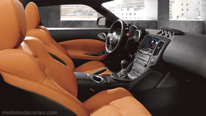 Espacio interior de 2 plazas.El coupé deportivo de 2 plazas Nissan 370Z 2015 es el actual heredero de la legendaria serie Z de Nissan. El Nissan 370Z tiene una longitud de 4250 mm, altura de 1315 mm y anchura de 1845 mm sin los espejos retrovisores exteriores. Por su mecánica de altas prestaciones y baja altura, clasificamos el Nissan 370Z en la categoría de coches deportivos. Este modelo del año 2015 tiene el mismo tamaño respecto a las medidas del Nissan 370Z 2011. Modelo de 2015 en venta como nuevo hasta 2020.