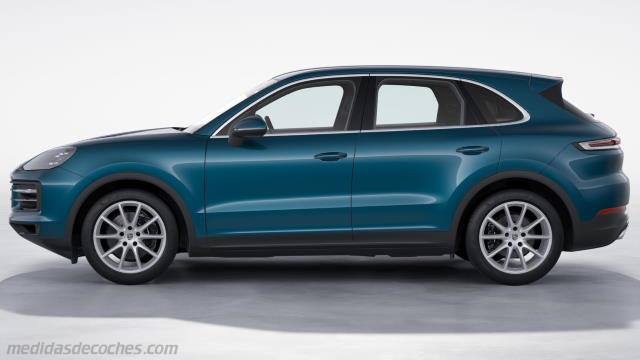Espacio interior de 5 plazas.Manteniendo las medidas exteriores, el Porsche Cayenne se renueva en 2024 con un salpicadero completamente nuevo. El Porsche Cayenne tiene una longitud de 4930 mm, altura de 1698 mm, anchura de 1983 mm sin espejos retrovisores exteriores y una medida de 2194 milímetros con los retrovisores abiertos. El modelo híbrido enchufable recibe el nombre de Cayenne E-Hybrid y tiene una capacidad del maletero de 627* litros. Por su tamaño, características y altura libre al suelo de 21 cm, clasificamos el Porsche Cayenne en la categoría de SUV grandes y todoterrenos. Este modelo del año 2024 tiene el mismo tamaño respecto a las medidas del Porsche Cayenne 2018.
