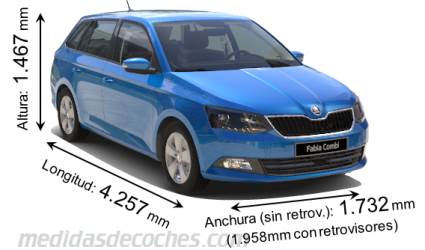 Espacio interior de 5 plazas.Con gran funcionalidad y espacioso interior, el Skoda Fabia Combi 2018 es 26 centímetros más largo que el Fabia con una impresionante capacidad del maletero de 530 litros. El Skoda Fabia Combi tiene una longitud de 4262 mm, altura de 1467 mm, anchura de 1732 mm sin espejos retrovisores exteriores y una medida de 1958 milímetros con los retrovisores abiertos. Por su versatilidad y mayor espacio trasero, clasificamos el Skoda Fabia Combi en la categoría de coches familiares. Este modelo del año 2018 tiene el mismo tamaño respecto a las medidas del Skoda Fabia Combi 2015. Modelo de 2018 en venta como nuevo hasta 2021.
